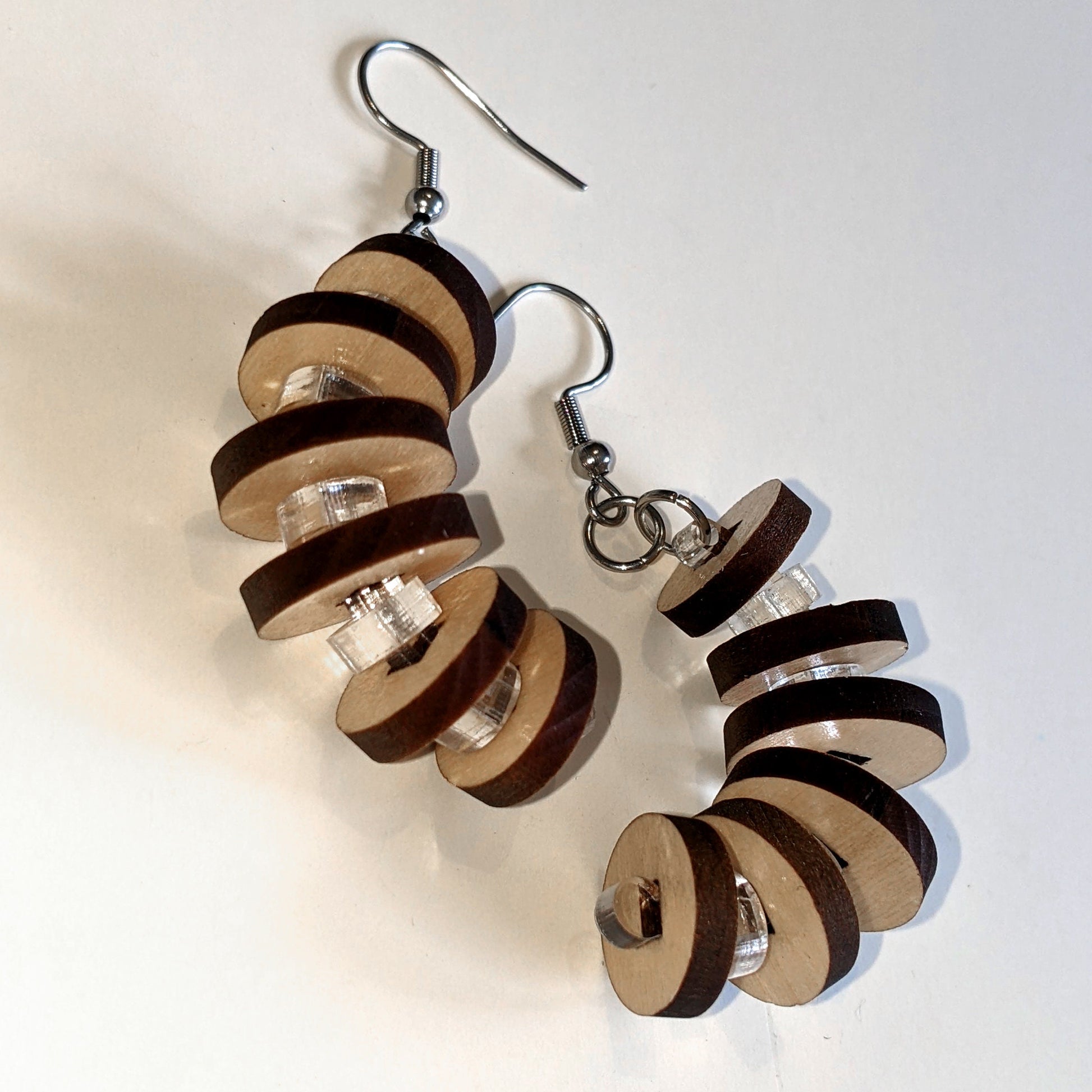 Laser cut hardwood fits onto clear acrylic giving the illusion of floating wooden discs in an arc shape.