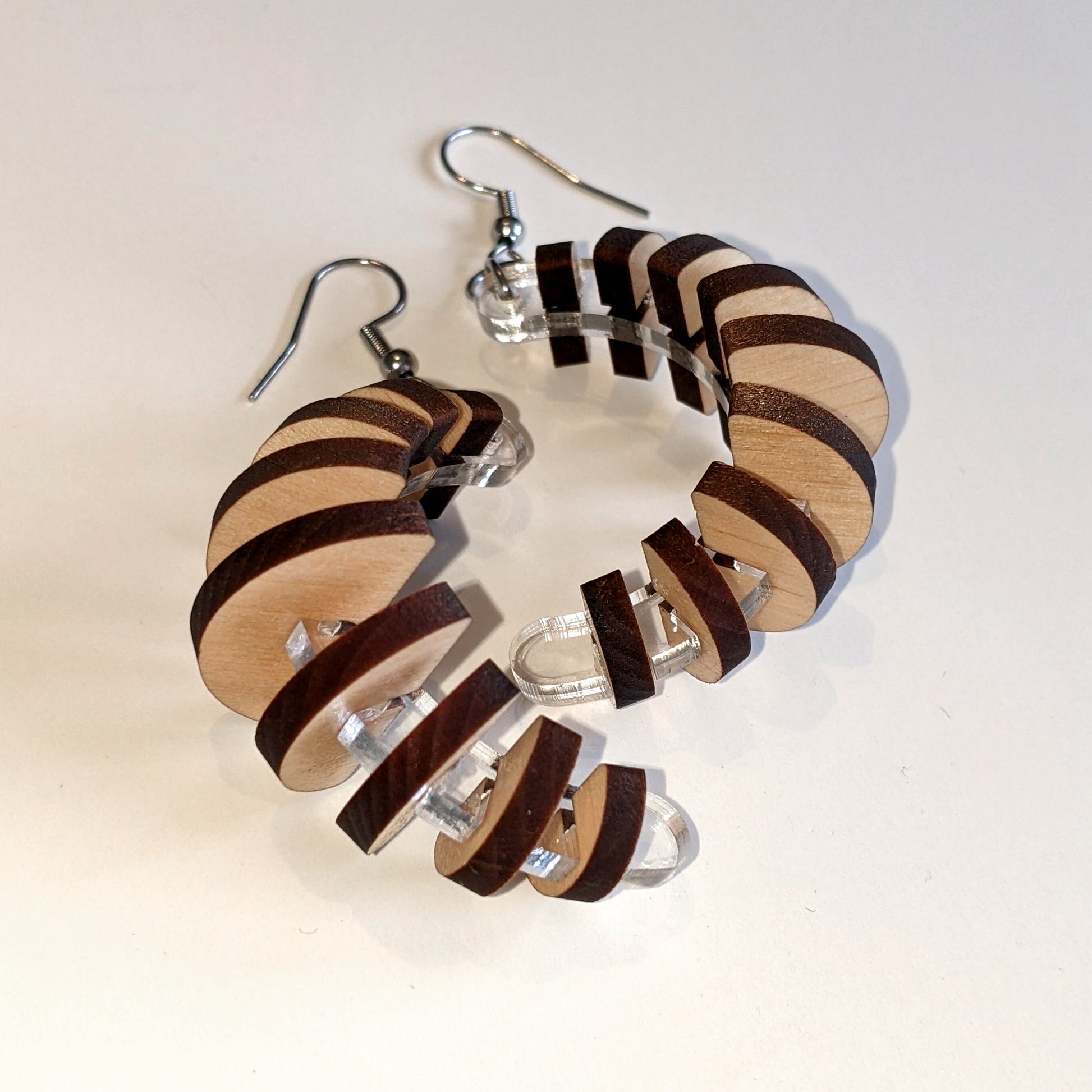 Laser cut hardwood fits into clear acrylic using a half lap joint giving the illusion of floating wooden discs in an arc shape.